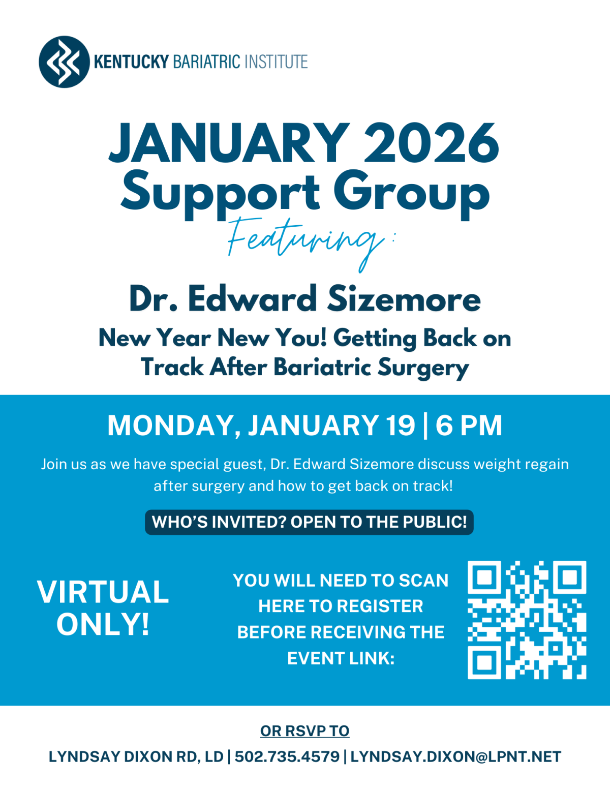 6 pm EST on Monday, January 19, 2026 Near Year New You! Getting Back On Track After Bariatric Surgery Join us as we have special guest, Dr. Edward Sizemore discuss weight regain after surgery and how to get back on track This is a great opportunity to learn more and connect with others on a similar journey. We hope to see you there! to the topic! Who's invited? Open to the public! Virtual ONLY Register by scanning the QR code below.